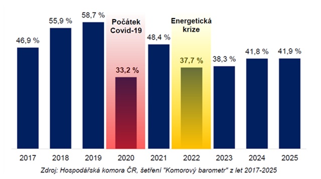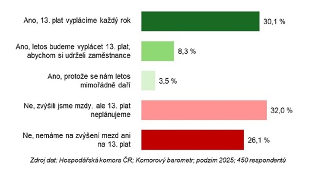 Časová řada Komorového barometru ukazuje, že podíl firem vyplácejících 13. platy úzce souvisí s celkovým stavem ekonomiky. V letech ekonomické konjunktury 2018–2019 benefit vyplácelo téměř 60 % podniků, během pandemie podíl klesl až na 33 %. S postupným ekonomickým zotavováním ukazatel mírně stoupá k současným téměř 42 %. (3.12.2025)