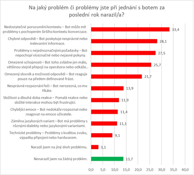 Vůbec nejčastějším problémem je nedostatečné porozumění ze strany bota. Celkem 33 % uživatelů uvedlo, že bot nedokázal pochopit kontext jejich dotazu. 28 % se pak setkalo s tím, že bot nepochopil složitější nebo méně jasné pokyny. Další více než pětina si stěžuje na omezený slovník, když bot reaguje jen na předem definované fráze. A problémy stále vnikají i kvůli prostému nerozeznání řeči.