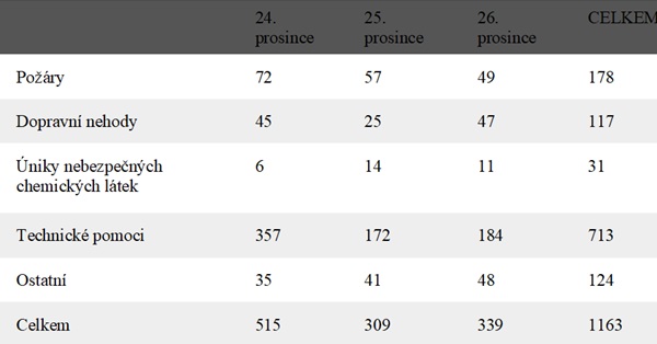Hasiči během vánočních svátků vyjeli k 1163 událostem. Nejvíce bylo technických zásahů, kterých jsme řešili 713, u požáru jsme zasahovali ve 178 případech. Nejvíc práce hasiči měli na Štědrý den, kdy jednotky požární ochrany vyjely celkem k 515 událostem. První svátek vánoční pak znamenal dalších 309 zásahů a na druhý svátek vánoční jsme řešili 339 událostí. Letošní rok tak byl co do počtu událostí mírně nadprůměrný.