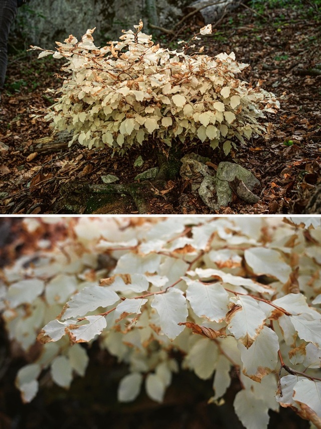 Bílý buk v Moravském krasu objevil Zdeněk Špíšek před 20 lety. Vyživuje jej buď jiný cizí strom, se kterým srostl, nebo houby. Bez této „rodičovské“ podpory by strom samostatně nedokázal existovat. Listy bez chlorofylu nejsou schopné jej samostatně uživit. Zahyne-li zdroj jeho obživy, brzy zahyne také. FOTO: Tomáš Figura, Botanický ústav AV ČR