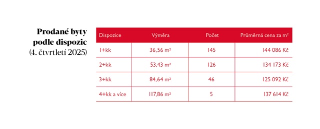 Rok 2025 ukázal, že brněnský trh se dokázal rychle přizpůsobit prostředí dražšího financování. Nejprodávanějšími se staly menší byty, které lépe odpovídají možnostem domácností v době vyšších úrokových sazeb. Dispozice 1+kk a 2+kk tvořily drtivou většinu všech transakcí a jen ve čtvrtém čtvrtletí se jich prodalo 271.