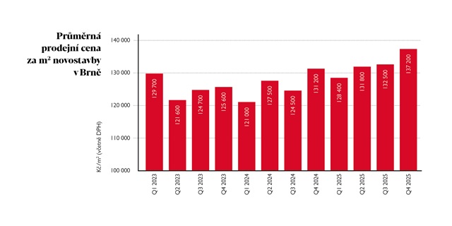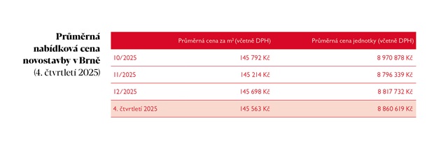 Rok 2025 se zařadil mezi nejúspěšnější v historii brněnského realitního trhu. Podle dat společnosti Trikaya, která trh dlouhodobě sleduje, se v průběhu roku v moravské metropoli prodalo 1 405 nových bytů, což představuje nejvyšší roční objem prodejů za posledních téměř deset let. Zároveň výrazně vzrostly ceny – průměrná nabídková cena novostaveb ve čtvrtém čtvrtletí překročila hranici 145 tisíc korun za metr čtvereční, což představuje meziroční nárůst o 11 procent.