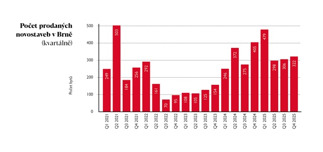 Ani závěr roku nepřinesl výraznější ochlazení trhu a ukázal, že Brno těží z pozice silného regionální centra. Ve čtvrtém čtvrtletí roku 2025 se prodalo 322 bytů, což je sice v meziročním srovnání o 83 jednotek méně, celková roční bilance však zůstává jednoznačně pozitivní. Výsledek roku 2025 překonal i dosud velmi úspěšný rok 2024, ve kterém se prodalo 1 298 novostaveb.