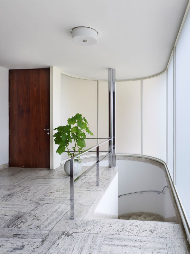 Hlavní vstup do domu je za obloukem stěny z mléčného skla. Jednokřídlé vstupní dveře jsou opatřeny dýhou z palisandru. Dveřní křídlo zaujímá celou světlou výšku místnosti (3 m), podobně jako všechny další dveře do obytných místností. Mies považoval dveře a okna za součásti stavby, nikoli za díry do stěn. U stěny stojí kopie původního nábytku, kulatý stolek) se dvěma křesly typu Stuttgart. Vpravo je vstup do rodičovské sekce a šatna se zrcadlem. Z ulice Černopolní prosvětlovala halu zaoblená stěna z neprůhledného skla, jehož povrch je z vnější strany lesklý a matný z vnitřní strany. Stěna byla za války zazděna.