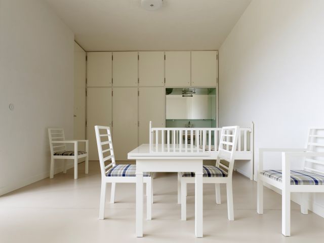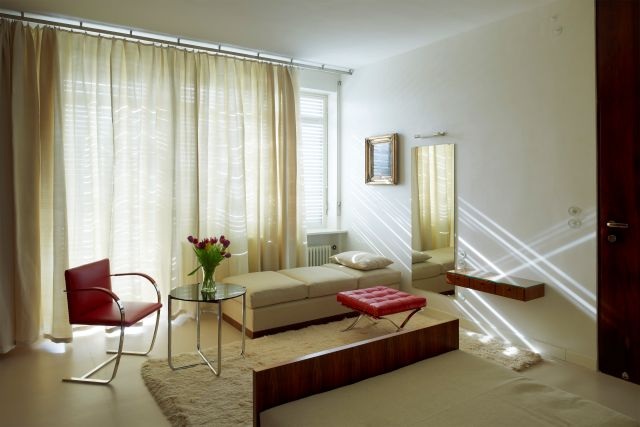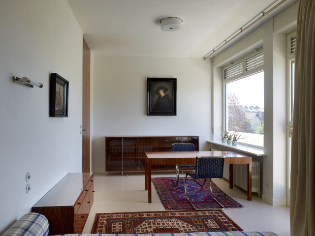 Pokoj vychovatelky Vlevo za vstupem jsou vestavěné skříně dýhované zebranem s ukrytým umyvadlem. Před skříněmi je lůžko, u okna obdélný psací stolek se židlí Stuttgart a pro odpočinek křeslo Tugendhat s textilním károvaným potahem. Z chodbičky je pak možné vstoupit do společné koupelny.