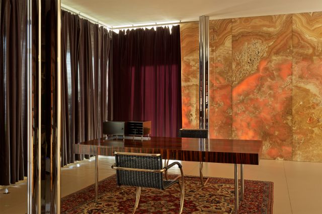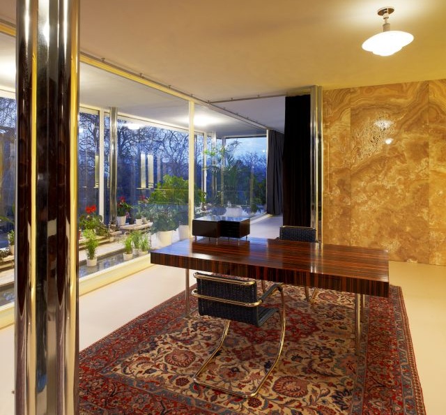 Hlavní obytný prostor je přístupný ze vstupní haly po jednoramenném schodišti, které ústí v malé předsíňce. Z předsíňky se vstupuje prosklenými dveřmi do hlavního obytného prostoru. Ocelový nosný skelet vily umožňuje volnou variaci tzv. plynoucího prostoru, jehož jednotlivé funkční zóny naznačuje pouze přímka onyxové a funkční zóny příčky, společně s pravidelným rytmem ocelových nosných sloupů a rozestavěním nábytku. Významnou součást obytného prostoru představují původní materiály. Jako syn kameníka znal Mies již od svého dětství krásu kamene a velice ho miloval. Na onyxovou stěnu našel kámen v Hamburku, kde měl sloužit k výrobě dvou velkých váz pro luxusní parník. Byl závazně prodán, a proto ho nechtěli absolutně Miesovi postoupit. On byl však tak nadšen jeho krásou, že ho nakonec získal. Medově žlutá hornina s bílou kresbou byla vytěžena v pohoří Atlas v Maroku. Tento polodrahokam v zimních slunných dnech vyniká zvláštní schopností – sluneční paprsky při západu slunce prosvítají stěnou a ta mění svoji barevnost. Petrografickým rozborem se zjistilo, že to je skutečnosti aragonitový sediment (uhličitan to vápenatý). Jedná se o tzv. nepravý onyx, karbonátovou horninu (CaCO3), druh vápence – aragonit. V případě skutečného onyxu by se muselo jednat o oxid křemíku (SiO2), což je polodrahokam – chalcedon. Prostor jídelny je vymezen zaoblenou příčkou dýhovanou makassarským ebenem, která obklopuje jídelní stůl. Původní příčka byla z interiéru odstraněna už v roce 1940. Zásluhou historika umění Miroslava Ambroze byla v roce 2011 objevena v menze Právnické fakulty Masarykovy univerzity v Brně, kde byla druhotně použita jako obklad stěny. Díky náročné práci restaurátorů se tento autentický prvek vrátil na své místo v rámci památkové obnovy vily v roce 2012.Kulatý jídelní stůl je přesnou replikou vyrobenou dle původních plánů. je možné využívat ve třech možných velikostech. Deska stolu spočívá na ocelové noze se stejným profilem jako u nosných sloupů. Konstrukční a estetickou jedinečnost doplňuj řada nadčasových technických prvků. Jedná se například o systém vzduchotechniky, který je v celém hlavním obytném prostoru využíván k vytápění, filtraci či chlazení vzduchu. Neméně nadčasový je systém, který umožňuje velkoformátová okna v jídelně a před onyxovou příčkou kompletně zapustit do úrovně podlahy. Podél oken si můžeme všimnout chromovaných registrů ústředního vytápění, které zamezují srážení vlhkosti na skle. K posezení jsou tři křesla Tugendhat, se stříbrošedý látkovým potahem i křesla a taburet Barcelona ve smaragdově zelené kůži, rubínově červené lehátko Za posezením je replika sochy Torzo kráčející od německého sochaře Wilhelma Lehmbrucka Jsou tu i židle typu Brno.