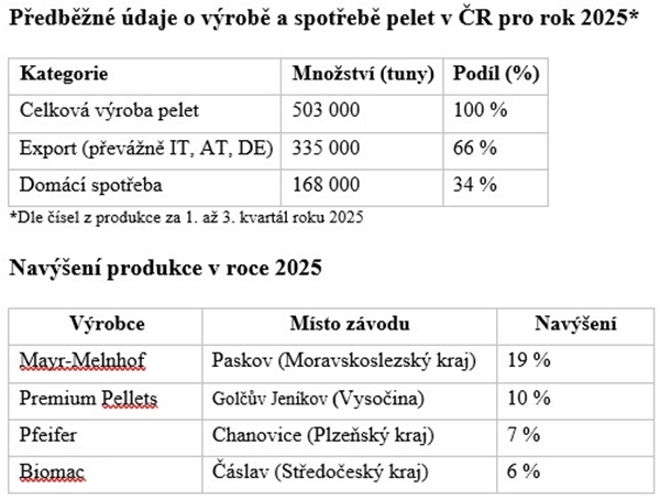 Zájem domácností o české dřevěné pelety a brikety v letošním roce skutečně výrazně stoupl. Dva největší domácí výrobci zvýšili výrobu o desítky tisíc tun pelet ročně za období prvních tří čtvrtin roku 2025 ve srovnání se stejným obdobím roku 2024: Pfeifer zvýšil výrobu o 7 % v závodě v Chanovicích a Mayr-Melnhof dokonce o 19 % v závodě v Paskově. Mezi středně velkými výrobci rostla produkce například u společnosti Premium Pellets o 10 % a u rodinné firmy Biomac o 6 %.