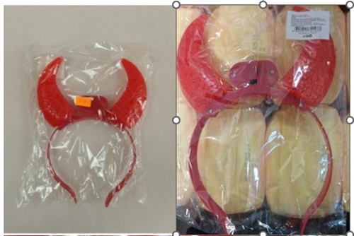 Plastová bateriová hračka „čertovské rohy“ ve tvaru čelenky byla vložena do průhledného plastového obalu se štítkem s informacemi o výrobku v českém jazyce.