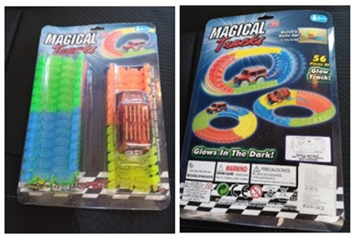 Plastová hračka na tužkové baterie ve tvaru auta s přiloženou plastovou dráhou a světlem byla zabalena v plastovém obalu s papírovou manžetou. Na zadní straně papírové manžety byla umístěna papírová lepící etiketa s informacemi o výrobku v českém jazyce.