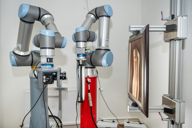 „Celý přístroj, systém, tvoří dvě robotická ramena. Na jednom je připevněn zdroj rentgenových paprsků, druhé nese pokročilou kameru, která umí zachytit okem neviditelné záření. Pro rentgenové snímání využíváme pixelové detektory, které netrpí šumem a jsou vysoce citlivé,” vysvětluje odborník na zobrazování Michal Pech.