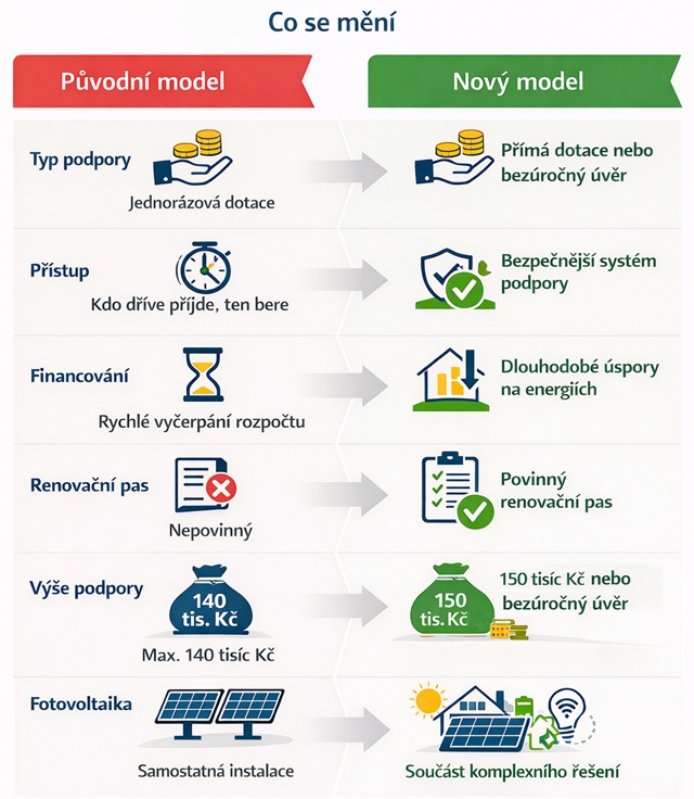 Nově budou moci domácnosti, SVJ a bytová družstva využít bezúročné úvěry na energetické renovace, FVE, tepelná čerpadla, zateplení, výměnu oken, rekuperaci nebo další opatření. Úvěry budou poskytovat banky a stavební spořitelny, zatímco úroky uhradí za žádající stát. Díky tomu domácnosti získají financování s nulovým úrokem, typicky se splatností deset až patnáct let.