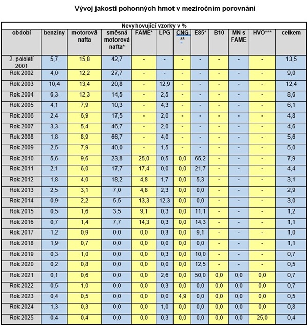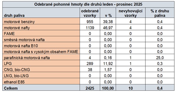 Česká obchodní inspekce kontroluje a sleduje jakost pohonných hmot /motorové benziny, motorové nafty, FAME, směsná motorová nafta, motorová nafta B10, motorová nafta s vysokým obsahem FAME, parafinická motorová nafta (HVO), LPG, CNG, bio-CNG, LNG, bio-LNG a ethanol E85/ formou odběrů vzorků a laboratorních rozborů. Kontrolováno bylo dodržování ustanovení § 3 odst. 1 zákona č. 311/2006 Sb., o pohonných hmotách a čerpacích stanicích pohonných hmot, ve znění pozdějších předpisů. Stanoveným jakostním požadavkům nevyhovělo 10 vzorků, což v celkovém hodnocení představuje 0,4 % nevyhovujících vzorků.