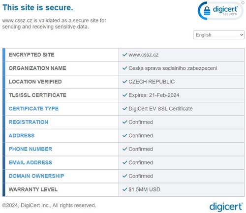 Jediné oficiální stránky ČSSZ jsou www.cssz.cz a eportal.cssz.cz, jejich bezpečnost garantuje digitální pečeť společnosti DigiCert umístěná na webové stránce vpravo dole. Po kliknutí na pečeť se zobrazí identifikační údaje ČSSZ a návštěvník stránek snadno zjistí všechny informace o majiteli webu. (17.2.2026)