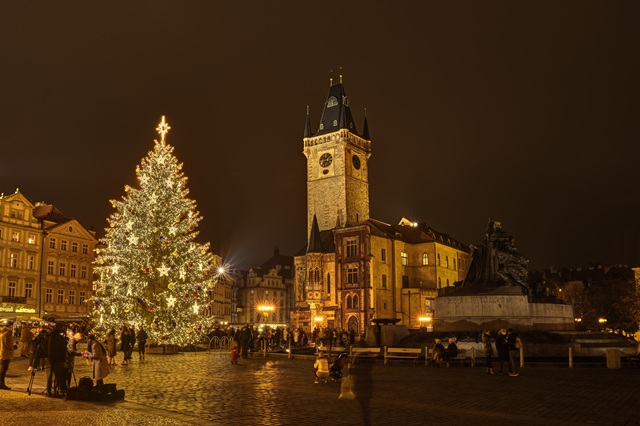 Vánoční výzdoba Staroměstského náměstí v Praze s dominantním stromem v tradičních barvách