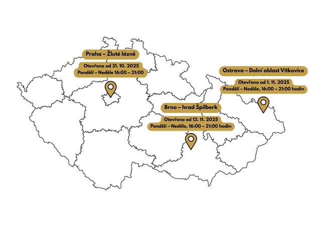 Vedle nové pražské expozice mohou návštěvníci zažít také další světelné výstavy v České republice – například na brněnském Špilberku, který je dominantou města, nebo v jedinečném industriálním areálu Dolní Vítkovice v Ostravě. Každá výstava je originální a všechny spojuje snaha přinášet krásu, radost a inspiraci.