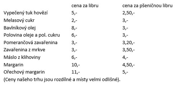 Větší množství vody, přidané do náhražky másla, nemá vlivu na úsporu v ceně, leda tím, že obsažený v ní olej poskytuje hustší látku, kterou lze na chleba mazati. Prohlédněte si tedy následující tabulku, v níž jsou uvedeny ceny za libru a za pšeničnou libru.