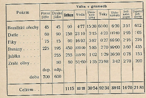 Následující tabulka podává denní záznamy osoby, jež se živí ovocnou a ořechovou stravou, jedla dvakrát denně a při každém jídle pouze jeden druh ořechů a jejíž zkušenost je značně dlouhá. Bylo-li třeba neobvyklé námahy duševní nebo tělesné, bylo množství stravy poněkud zvětšeno.