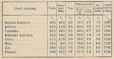 Z této tabulky je viděti, že kukuřici náleží první místo co do výživnosti. Kukuřice je charakteristickým produktem americkým. Asi třetina obdělávané půdy Spojených Států je oseta kukuřicí. Roční úroda její se odhaduje asi na 108 bilionů litrů, a jest asi třikrát větší než úroda pšenice, která jde hned za kukuřicí co do výživnosti.