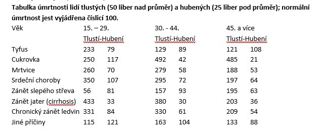 Tlustí lidé nejsou zdraví, ale naopak, zdraví lidé nejsou tlustí. Velká lež, vyjádřená oním lidovým rčením, kotví ve dvou falešných úvahách: Předně v domněnce, že jest dobře hodně jísti a tloustnouti proto, že potrava jest důležitá pro život a že člověk rád jí; za druhé proto, že opravdu nemocný člověk, který jest blízek smrti, jest jen kost a kůže, a prostá mysl lidu se tedy domnívá, že nejlepším lékem jest krajní opak, totiž otylost.