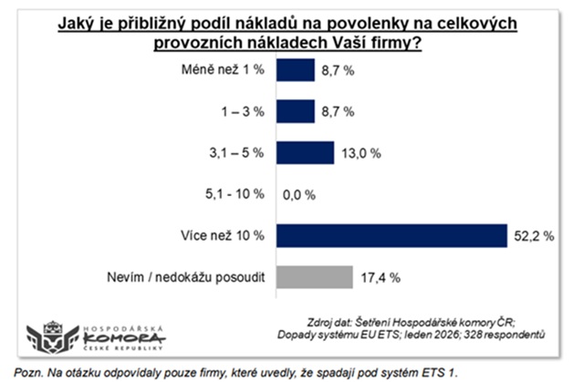 Evropský systém obchodování s emisními povolenkami (EU ETS) považují téměř tři čtvrtiny respondentů (72,6 %) za nespravedlivý. Z lednového šetření Hospodářské komory mezi firmami dále vyplývá, že více než polovina respondentů přímo spadajících do EU ETS 1 uvádí, že náklady na emisní povolenky tvoří více než 10 % jejich celkových provozních nákladů. Bezmála devět z deseti takových firem muselo zvýšené náklady promítnout do cen.