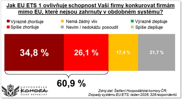 V důsledku toho se podle aktuálního šetření Hospodářské komory zhoršila konkurenceschopnost vůči producentům mimo EU u 60,9 % firem spadajících do systému EU ETS 1 a 17,4 % z nich zvažuje přesun výroby do zahraničí, případně k němu již v omezeném rozsahu přistoupilo. Vyplývá to z bleskového šetření Hospodářské komory o dopadech EU ETS mezi firmami.