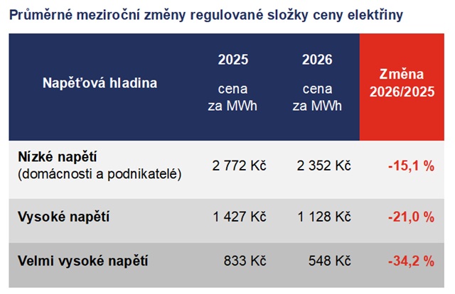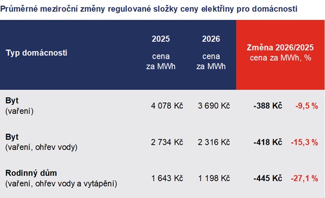 Energetický regulační úřad (ERÚ) vydal změnový cenový výměr, kterým snižuje regulované ceny elektřiny pro příští rok. Změnový cenový výměr vychází v návaznosti na usnesení vlády, kterým přechází financování provozní podpory podporovaných zdrojů energie (POZE) na stát. Díky této změně nebudou odběratelé již od 1. ledna 2026 v regulované složce ceny elektřiny platit žádné příspěvky na POZE.