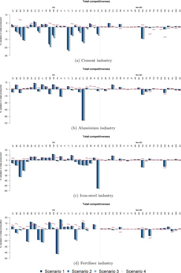 Dopad na jednotlivá nejvíce zatížená odvětví zachycují grafy níže, které pocházejí ze zmíněného odborného článku v žurnálu Energy Economics, jenž vyšel letos v únoru (viz https://sciencedirect.com/science/article/pii/S014098832400848X#fn12). Grafy zachycují také to, že dopad na některé země EU bude mnohem tíživější než na země mimo EU (které jsou v pravé části daných grafů).