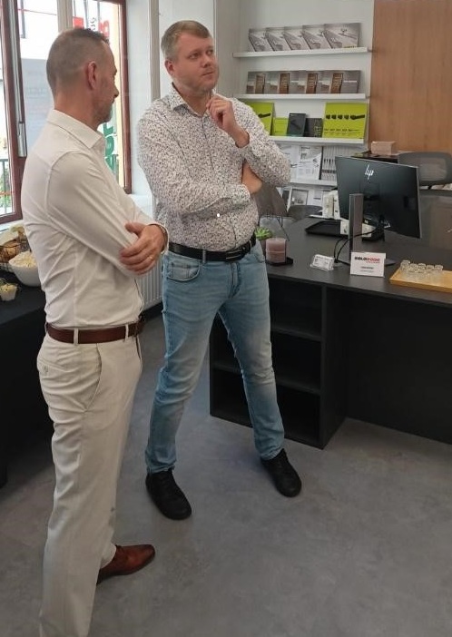 Obr. Vlevo Petr Konrád, zprava obchodní ředitel společnosti SOLODOOR Jiří Mužík na slavnostním otevření franchisové prodejny v Uherském Brodě
