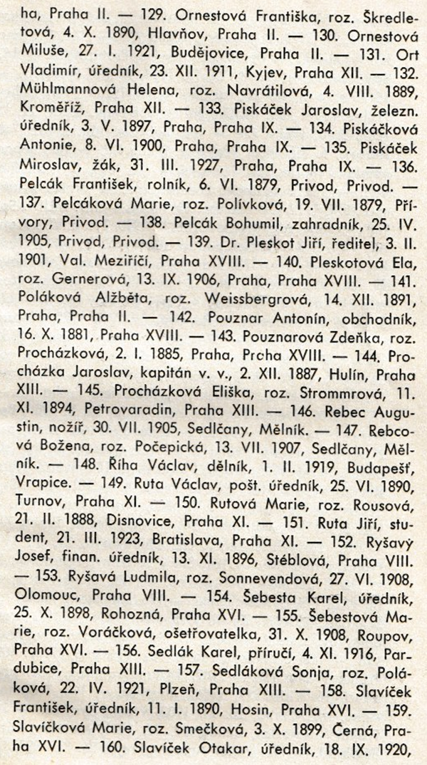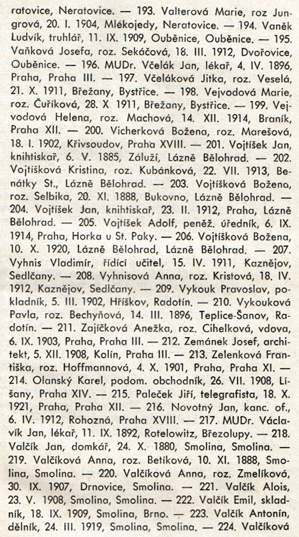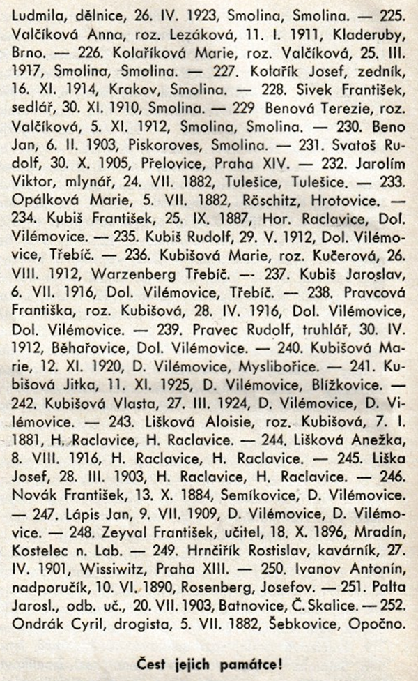 Osud parašutistů, kteří atentát provedli, a jejich blízkých jsou popsány v řadě knih a studií. Jména stovek dalších vlastenců upadla v zapomnění. Připomeňme si některá z nich, jak je uvádějí dobové prameny. K trestu smrti byly stanným soudem za ukrývání českých parašutistů odsouzeny 252 osoby. Přinášíme jejich seznam, jak byl publikován v knize Jana Drejse Za Heydrichem stín, Naše vojsko Praha 1947.