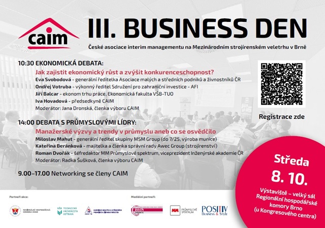 Akce České asociace interim managementu v Brně je určena nejen manažerům, ale i podnikatelům a dalším zájemcům z řad široké veřejnosti, které zajímají trendy, otázky konkurenceschopnosti a možnosti řešení různých firemních problémů. BUSINESS den CAIM se skuteční ve středu 8. října 2025 na výstavišti v budově Regionální hospodářské komory Brno.