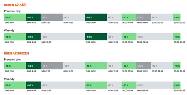 Pásma odrážejí ceny na velkoobchodním trhu nejen během dne, ale i v průběhu roku: během jara a léta vyrábějí přes den například solární elektrárny a cena elektřiny jde dolů. Pokud tedy například zákazník zapne myčku teď v říjnu v 11 hodin dopoledne, zaplatí proti svému tarifu o 10 % méně. Od dubna do září ale ve stejný čas zaplatí za provoz myčky jen polovinu obvyklé ceny.