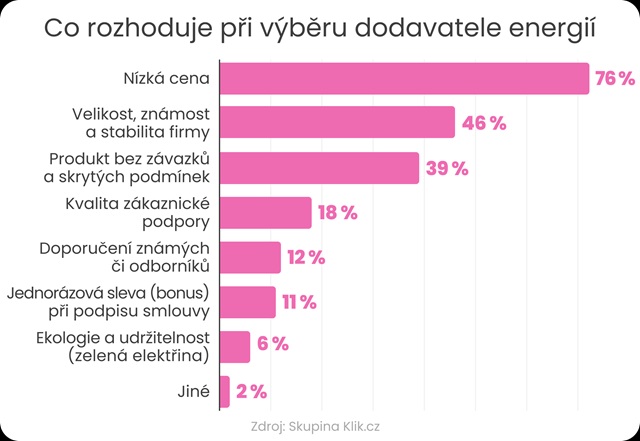Téměř polovina Čechů příliš nesleduje vývoj cen elektřiny a ve svém vyúčtování kontroluje pouze konečnou částku. Nejrozšířenějším je ve 45 % fixní tarif, který si zákazníci nejčastěji zřizují na jeden až dva roky. Spotové ceny využívá 22 % domácností. Třetina spotřebitelů si příležitostně srovnává nabídky dodavatelů a je připravena měnit za lepší, každý čtvrtý poté věří, že si lze vyjednat výhodnější cenu, než dodavatelé uvádějí v ceníku, vyplývá z průzkumu Skupiny Klik.cz.