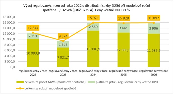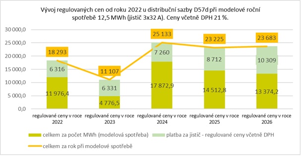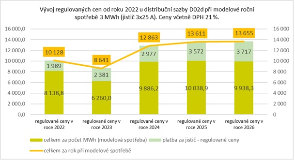 Na distribučním území ČEZ Distribuce u nejběžnější distribuční sazby D02d dojde k mírnému snížení ceny za megawatthodinu a zvýšení fixního platu, který známe jako platbu za jistič. Při modelové roční spotřebě 3 MWh vzrostou náklady za celý rok pouze o 44 Kč. Cenový růst tak představuje 0,3 %.