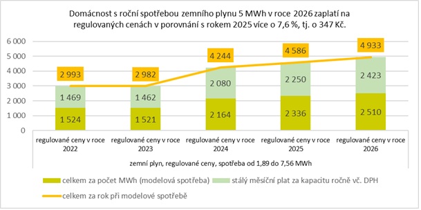 Podle návrhu zaplatí v roce 2026 domácnost s roční spotřebou zemního plynu 5 MWh o 347 Kč, tedy o 7,6 % více než v roce 2025.