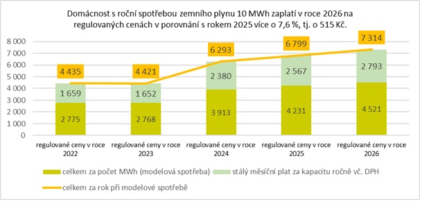 Podle návrhu zaplatí v roce 2026 domácnost s roční spotřebou zemního plynu 10 MWh o 515 Kč, tedy o 7,6 % více než v roce 2025.