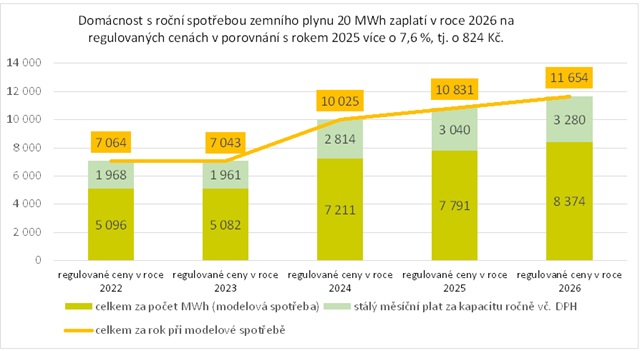 Podle návrhu zaplatí v roce 2026 domácnost s roční spotřebou zemního plynu 20 MWh o 824 Kč, tedy o 7,6 % více než v roce 2025.