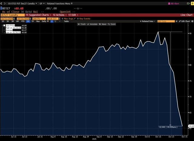 Emisní povolenky pro domácnosti jsou ve volném pádu. Přesně v polovině října uzavřel termínový kontrakt na ty s termínem vypořádání v roce 2027 na lipské energetické burze na ceně přes 90 eur, vyplývá z dat agentury Bloomberg. V poslední říjnový den skončily obchodování na ceně necelých 61 eur (viz graf Bloombergu níže). Takřka třetinový pokles má na svědomí zejména bruselský summit z minulého týdne.