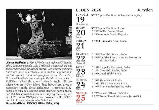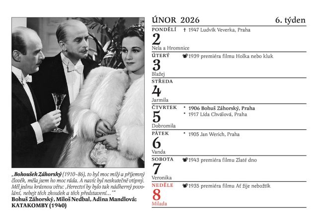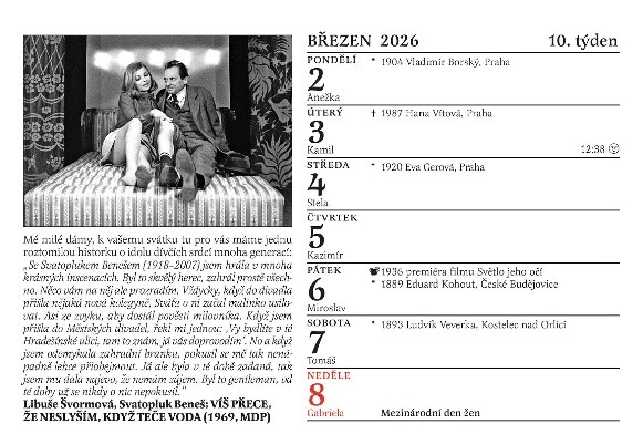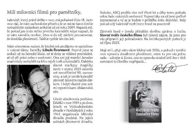Mladinká Libuše Švormová přišla do Městských divadel pražských v roce 1962 a stala se součástí slavné éry, které se říká „Ornestina“. Právě díky tomu měla možnost potkat a spolupracovat s plejádou nezapomenutelných osobností – Natašou Gollovou, Marií Rosůlkovou, Danou Medřickou, Josefem Kemrem, Svatoplukem Benešem, Ljubou Hermanovou, Vlastou Fabianovou a mnoha dalšími. Před kamerou stanula po boku Františka Smolíka, Miloše Nedbala, Karla Högera, Jana Pivce či Rudolfa Hrušínského. V novém Cibulkově kalendáři zve čtenáře na výjimečnou cestu do zákulisí tehdejšího uměleckého světa – do šaten, kde se rodilo přátelství, do ateliérů, kde vznikaly filmové legendy, i do soukromí hvězd, které jsme dosud znali jen z filmového plátna. „Libuše Švormová patří mezi poslední žijící pamětníky éry, která formovala české herectví. Její vyprávění je nejen poutavé, ale i dojemné a lidské. Každý týden kalendáře je malým okénkem do doby, která už se nevrátí,“ říká Aleš Cibulka.