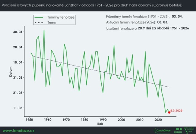 Letošní nástup jara je z hlediska reakce přírody opět velmi časný a potvrzuje trend nastolený v předcházejících třech letech. Jedná se již o čtvrtý rok v řadě, kdy habry obecné raší v první březnové dekádě března, přestože průměrný termín za období let 1951 až 2025 této vývojové (tzv. fenologické) fáze je na počátku dubna, konkrétně čtvrtého. Uvedla to na základě pozorování Lenka Bartošová z Ústavu výzkumu globální změny AV ČR – CzechGlobe a Mendelovy univerzity v Brně.