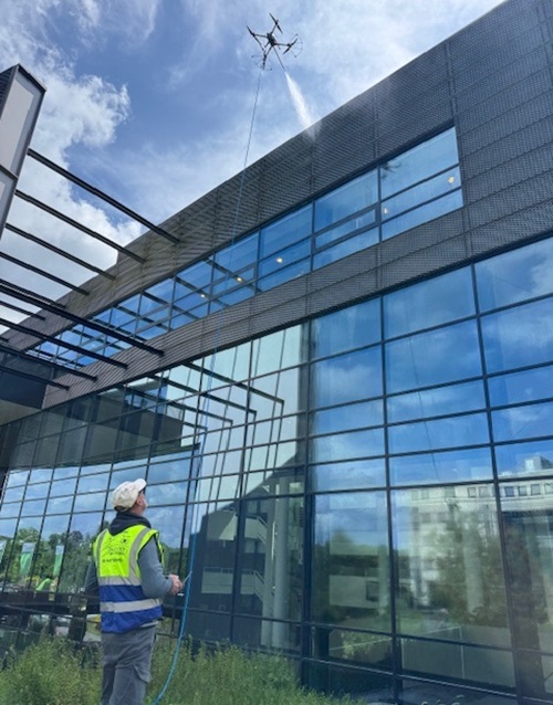 Po úspěšném pilotním nasazení na Slovensku v létě 2025 rozšiřuje společnost M2C tuto službu také na český trh. Profesionální systém DJI 350 RTK je určený pro čištění fasád, skleněných ploch, solárních panelů a dalších těžko přístupných povrchů.