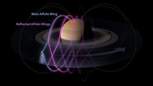 Ilustrace elektrodynamické interakce mezi Enceladem a Saturnem. Hlavní Alfvénovo křídlo je vyobrazeno modře, odražené vlny purpurově. Šipka znázorňuje směr rotace plazmového prstence měsíce Enceladus. Relativní velikosti Saturnu a Enceladu neodpovídají skutečnosti. Zdroj Europlanet, Design a animace: Fabrice Etifier – École Polytechnique