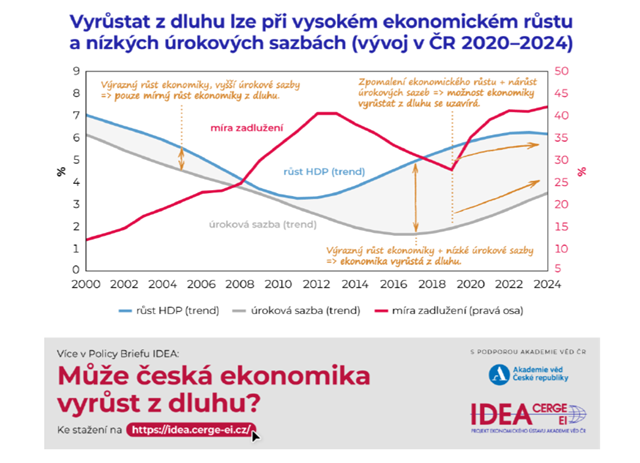 Think-tank IDEA při CERGE-EI zveřejňuje nový policy brief, který zkoumá, zda může česká ekonomika tzv. ‘vyrůst z dluhu‘. Tato představa stojí na myšlence, že míru zadlužení státu, tedy podíl jeho dluhu na hrubém domácím produktu (HDP), může snížit nejen redukce dluhu samotného, ale také vyšší ekonomický růst. Ekonomické principy říkají, že ekonomika může vyrůstat z dluhu, pokud tempo jejího nominálního růstu dlouhodobě převyšuje úrokovou sazbu, kterou stát musí za vypůjčené peníze, tedy dluh, platit. Analýza IDEA však dochází k závěru, že předpoklady pro vyrůstání české ekonomiky z dluhu se zhoršují a budou se velmi pravděpodobně zhoršovat i v budoucnosti.