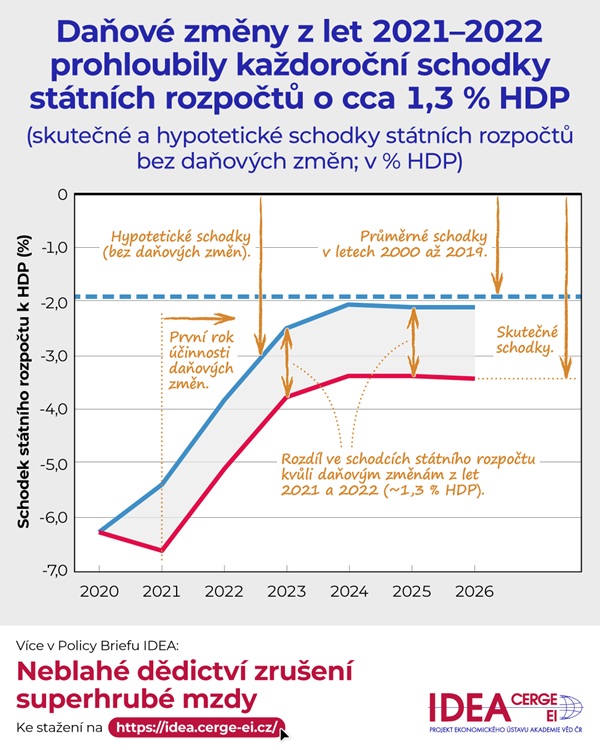 Tehdejší daňové změny vedly k výraznému snížení výběru daní. Nová analýza IDEA ukazuje, že tyto změny zvyšují každoroční schodky státního rozpočtu zhruba o 1,3 % HDP. Bez těchto změn by schodek plánovaný pro rok 2026 nebyl 3,5 % HDP, ale přibližně pouze 2,0 %, tedy blízko dlouhodobého průměru před pandemií.