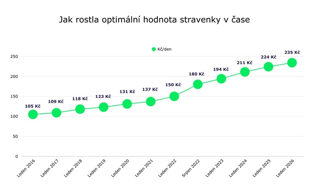 Ještě před několika lety se optimální hodnota stravenky zvyšovala pouze pozvolna, vždy o několik korun ročně. Výrazný zlom přišel v roce 2022, kdy kvůli vysoké inflaci došlo ke zvýšení hned dvakrát během jednoho roku. Oproti roku 2021 tak stravné skokově vzrostlo o 45 korun.
