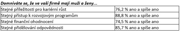 K nalomení tvrzení o nerovnosti nahrává také to, jak by zaměstnanci „oznámkovali“ přístup svých firem k rovným příležitostem mužů a žen. „Za jedna” by je ohodnotilo 16,7 % respondentů, 25,4 % by udělilo svému zaměstnavateli dvojku, 35,6 % trojku, 15,3 % za čtyři a 7,0 % za pět. Prostor pro zlepšení tedy firmy rozhodně mají.