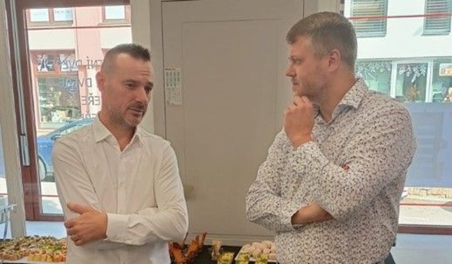 Vlevo Petr Konrád, vpravo obchodní ředitel společnosti SOLODOOR Jiří Mužík na slavnostním otevření franchisové prodejny v Uherském Brodě. Zdroj: Interiéry Konrád s.r.o.