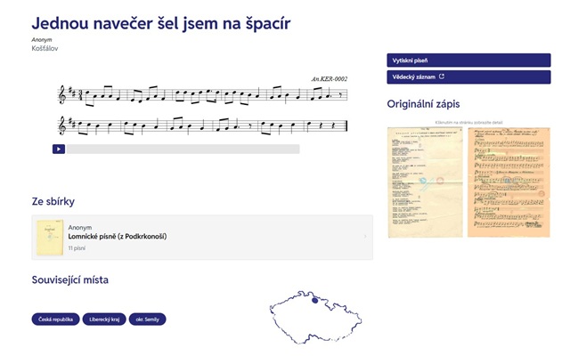 „Uživatelé mohou porovnat původní záznam i moderní přepis nebo si na portálu písňovou melodii přehrát,“ říká Matěj Kratochvíl z Etnologického ústavu AV ČR. „Samozřejmostí jsou podrobné informace o sběratelkách a sběratelích, mezi nimiž jsou vedle známých postav jako Karel Jaromír Erben, František Sušil nebo Leoš Janáček i osobnosti méně známé či dosud spojované s jinými obory, například významný chemik Bohuslav Brauner nebo – ze zcela mimoakademické sféry – obchodnice s textilem ze Strakonic Marie Foglarová,“ dodává hudební vědec a etnolog.