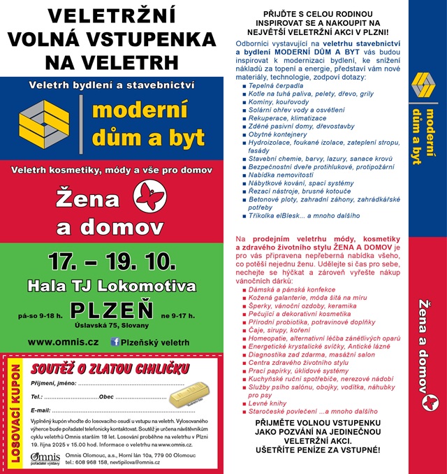 Od pátku 17. října do neděle 19. října se areál TJ Lokomotiva v Plzni promění v centrum inovací, stylu a rodinné pohody. Koná se zde již 18. ročník veletrhu stavebnictví a bydlení Moderní dům a byt, který se letos opět spojí s veletrhem kosmetiky, módy a zdravého životního stylu Žena a domov. Tato jedinečná kombinace dvou tematicky odlišných, ale vzájemně se doplňujících akcí přináší návštěvníkům pestrou paletu produktů, služeb a inspirace pro každodenní život.