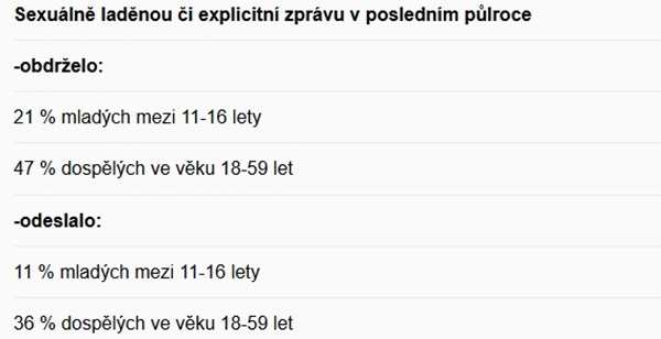 Sexting se stal běžnou součástí digitálního života českých dospělých. Videa, fotky nebo textové zprávy se sexuálním obsahem si posílá více než třetina populace a v generaci mezi 18–29 lety je to téměř polovina.
