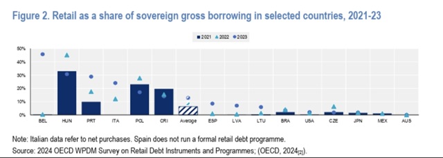 Z mezinárodního srovnání, jež vychází z dat OECD, přitom plyne, že Česko má rezervu v možnosti využívání dluhopisových programů pro domácnosti. Podíl domácností mezi věřiteli vlády byl v Česku dle dat OECD roku 2023 nižší než například v Belgii, Maďarsku, Portugalsku, Itálii, Polsku, Španělsku, Lotyšsku, Litvě, ale i než třeba v Brazílii či v USA (viz graf OECD níže). (8.11.2025)